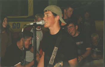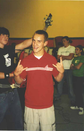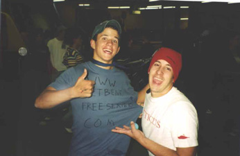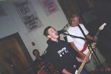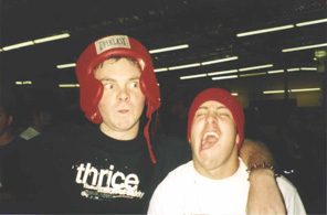 | Crazy Bent Fans Limited Potentials lead singer Ryan Baker (left) and Jake Nelson. Both decide to have some preshow fun at Bents performance at Some Dudes Playground on October 26th, 2002. |