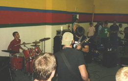 Devin Improvises. During a song at the Somedudes Playground show (OCT. 26) Devins guitar strap broke. His quick wits (Yeah, Right!!!) lead him to a knee as he dropped his mic stand down and continued his parts in the song. |